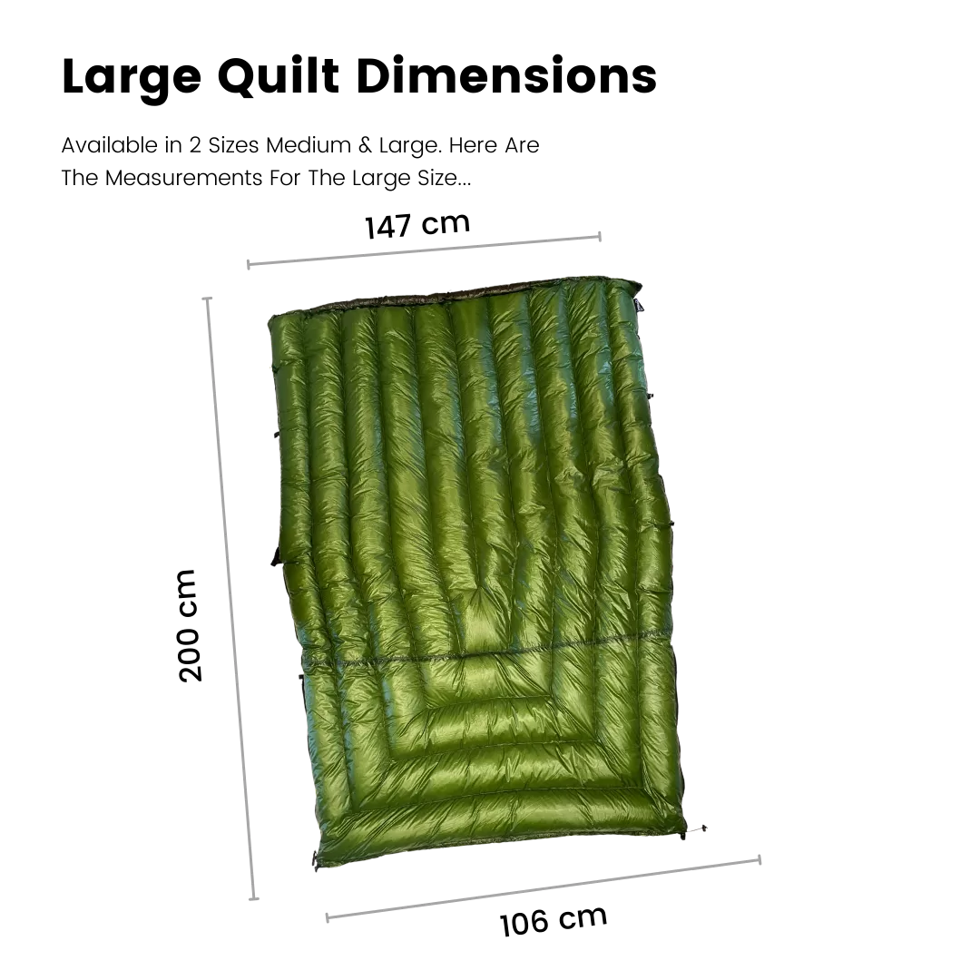 This Ultralight Quilt is Available in 2 sizes, Regular & Large. Its Compact Size When Packed Makes It Perfect For Backpacking & Wild Camping.